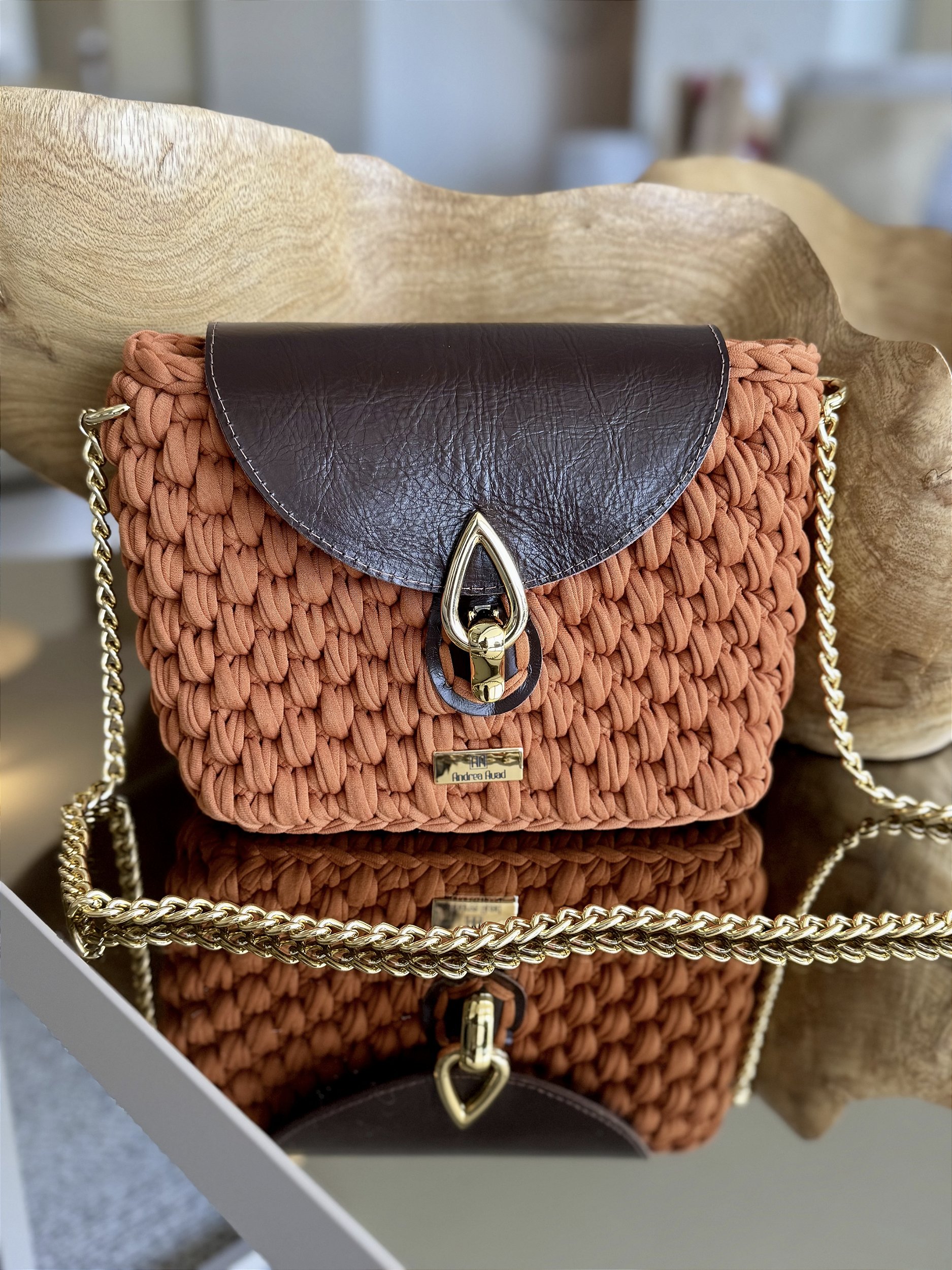 Bolsa confecccionada em fio de malha premium com aba de couro. Possui forro interno, fecho de metal e alça de corrente.