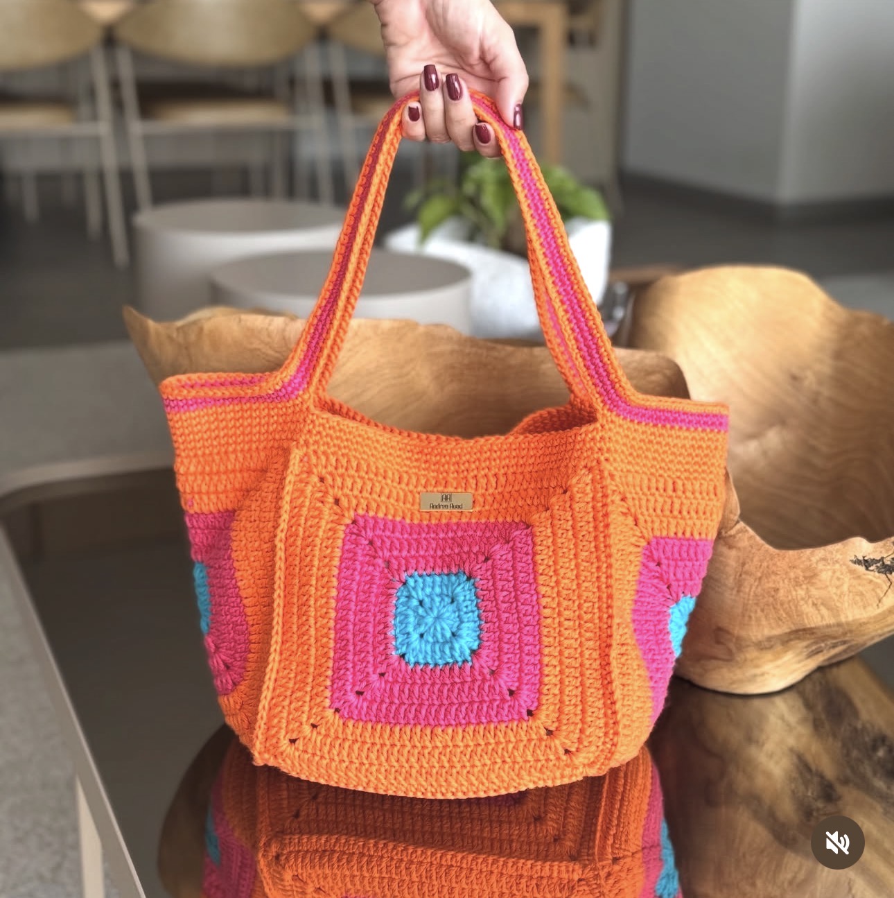 Bolsa confeccionada em barbante, com forro e fecho de imã.