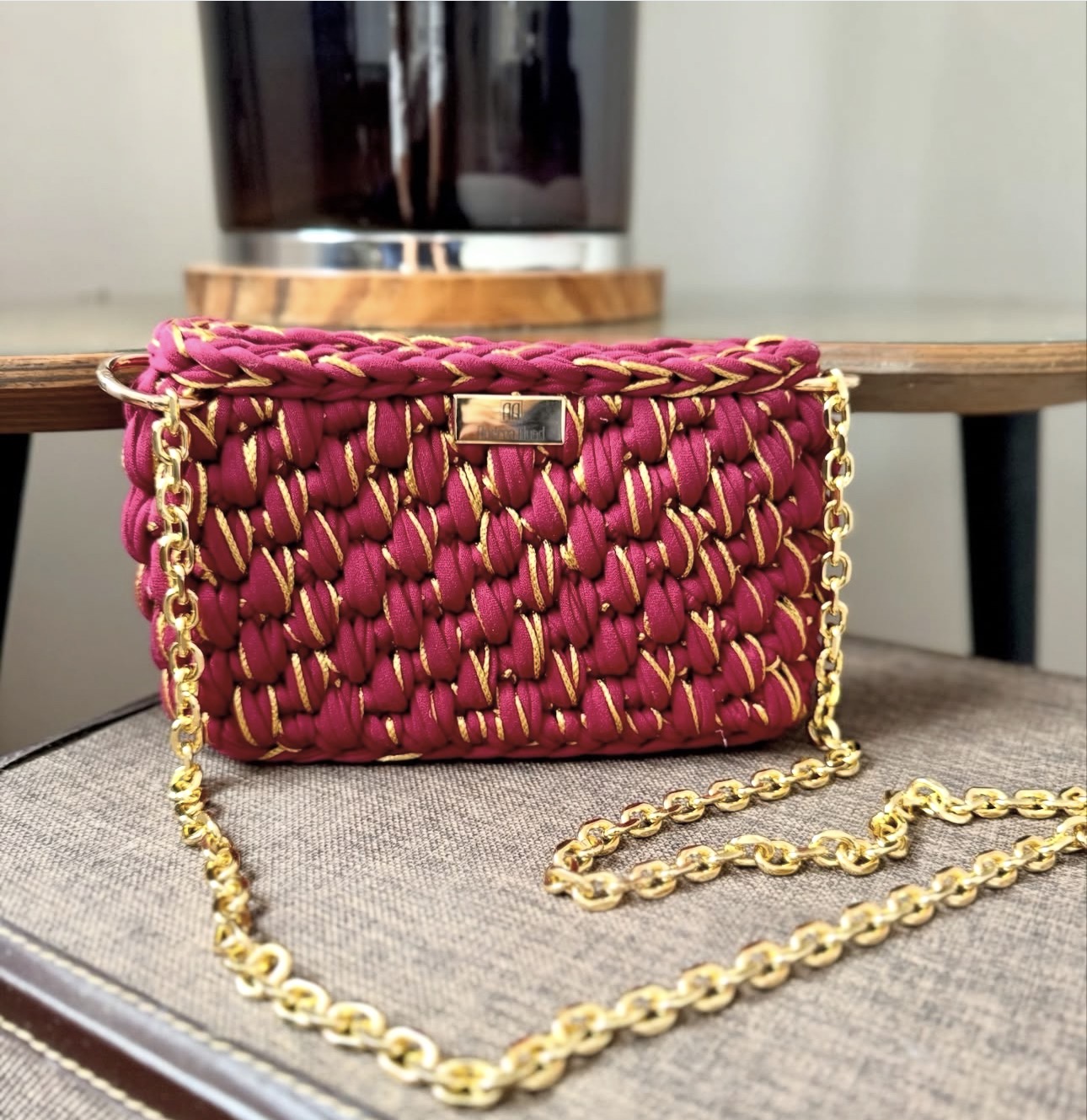 Confeccionada em fio de malha premium e fio de seda. Possui fecho de imã e alça de corrente.