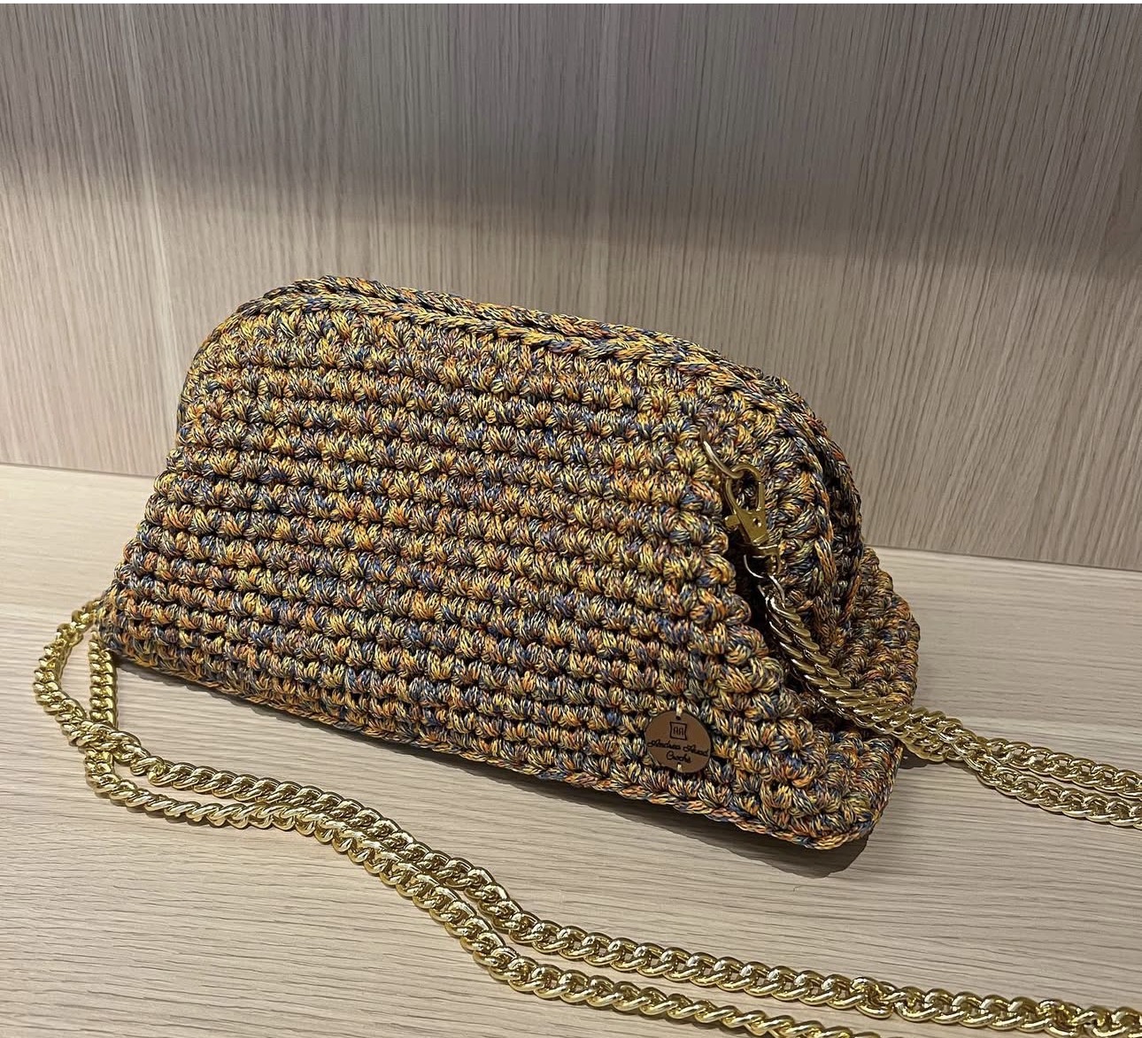 Clutch confeccionada em fio náutico e com fecho boca de lobo ou fecho da vovó.